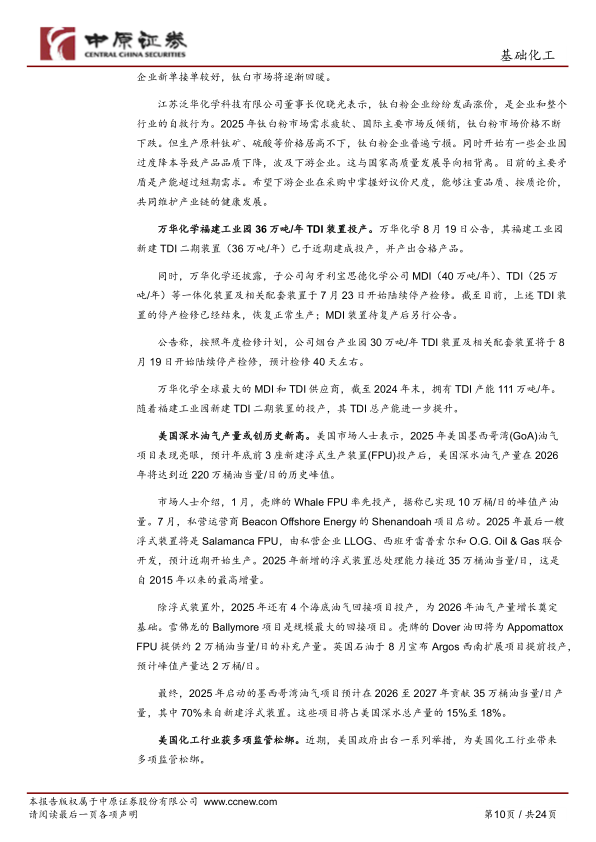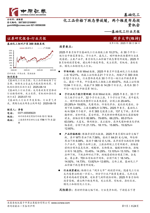 2025年8月份中信基础化工行业指数上涨10.21%,在30个中信一级行业中排名第9位。子行业中,氟化工、碳纤维和改性塑料行业表现居前。主要产品中,8月份化工品价格下跌态势有所放缓。2025年9月份的投资策略,建议两个维度布局,关注农药、有机硅、涤纶长丝、煤化工和轻烃化工行业。