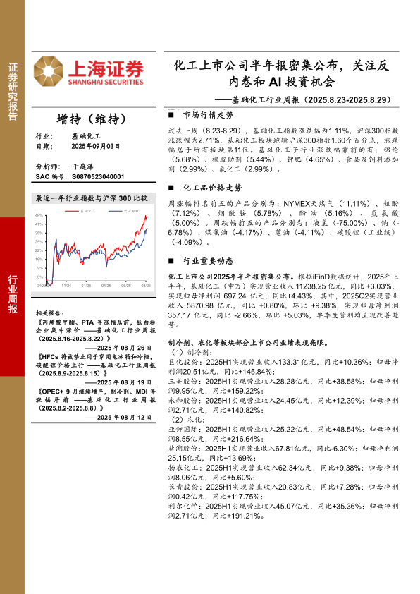 基础化工行业周报:化工上市公司半年报密集公布,关注反内卷和AI投资机会