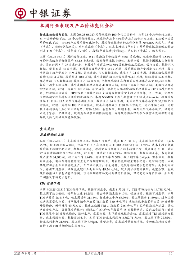 本周(08.25-08.31)均价跟踪的100个化工品种中,共有33个品种价格上涨,31个品种价格下跌,36个品种价格稳定。跟踪的产品中46%的产品月均价环比上涨,43%的产品月均价环比下跌,11%的产品月均价环比持平。周均价涨幅居前的品种分别是NYMEX天然气甲醛(华东)、硝酸(华东地区)、无水氢氟酸(华东)、环氧氯丙烷(华东);周均价跌幅居前的品种分别是TDI(华东)、煤焦油(山西)、尿素(华鲁恒升(小颗粒))、甲乙酮(华东)、维生素E。