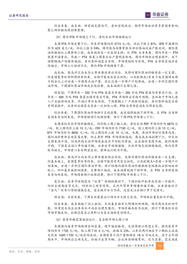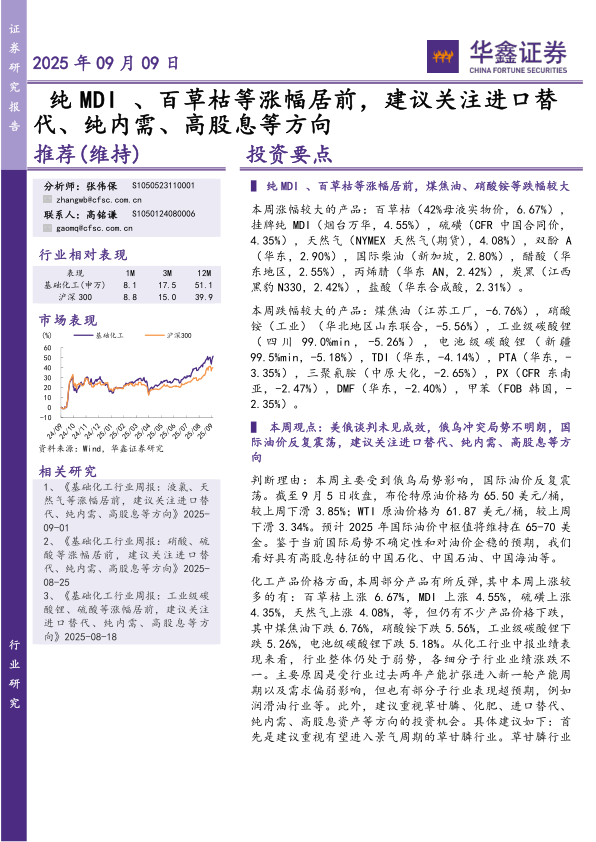 化工产品价格方面,本周部分产品有所反弹,其中本周上涨较多的有:百草枯上涨6.67%,MDI上涨4.55%,硫磺上涨4.35%,天然气上涨4.08%,等,但仍有不少产品价格下跌,其中煤焦油下跌6.76%,硝酸铵下跌5.56%,工业级碳酸锂下跌5.26%,电池级碳酸锂下跌5.18%。从化工行业中报业绩表现来看,行业整体仍处于弱势,各细分子行业业绩涨跌不一。主要原因是受行业过去两年产能扩张进入新一轮产能周期以及需求偏弱影响,但也有部分子行业表现超预期,例如润滑油行业等。此外,建议重视草甘膦、化肥、进口替代、纯内需、高股息资产等方向的投资机会。具体建议如下:首先是建议重视有望进入景气周期的草甘膦行业。草甘膦行业目前经营困难,底部特征明显,库存持续下降,价格近期开始上涨,在海外进入补库存周期的大背景下,行业有可能进入景气周期,继续推荐江山股份、兴发集团、扬农化工等;第二,在行业整体机会不多的情况下,精选竞争格局和盈利能力相对较好且具备量增的成长性个股。持续看好竞争格局较好的润滑油添加剂行业中具备持续成长性且空间广阔的国内龙头瑞丰新材、盈利能力相对较好的煤制烯烃行业中具备量增逻辑且估值较低的宝丰能源;第三,在关税不确定性的影响下,出口预计会受到影响,内循环需要承担更多的增长责任,化工行业中产业链在国内且主要需求也在国内的有化学肥料行业及部分农药行业中的子产品,其中氮肥和磷肥、复合肥自给自足内循环,需求相对刚性,继续看好华鲁恒升、新洋丰、云天化、亚钾国际、中国心连心化肥、利民股份等,中国心连心化肥做重点推荐。最后,在国际油价上涨的背景下,我们继续看好具有最高资产质量和高股息率特征的三桶油。化工行业中云天化、兴发集团、龙佰集团等细分子领域龙头企业也有5%左右股息率,在红利资产中具有较强吸引力。