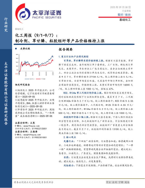 化工行业周报:制冷剂、草甘膦、粘胶短纤等产品价格维持上涨