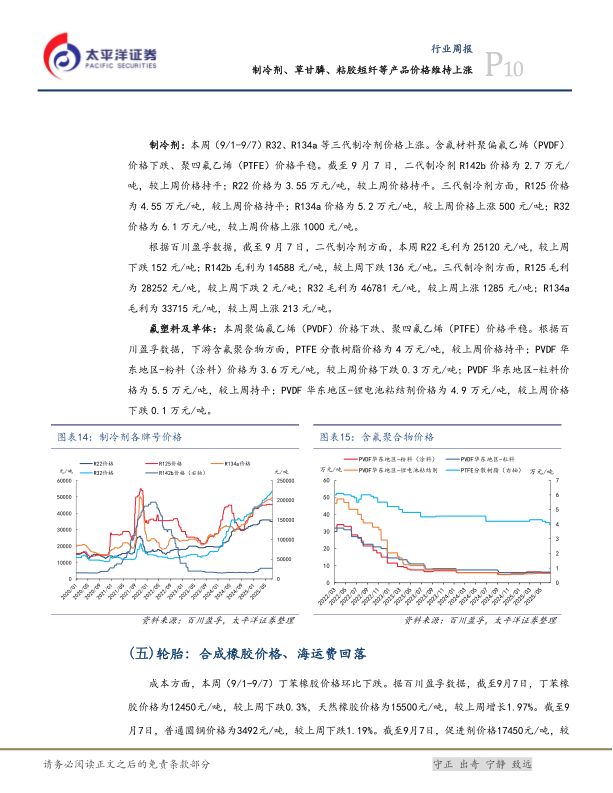 R32、R134a等三代制冷剂价格上涨。制冷剂刚性需求稳步增长,同时在配额政策限制下行业供给弹性受限。截至9月7日,二代制冷剂R142b价格为2.7万元/吨,较上周价格持平;R22价格为3.55万元/吨,较上周价格持平。三代制冷剂,R125价格为4.55万元/吨,较上周价格持平;R134a价格为5.2万元/吨,较上周价格上涨500元/吨;R32价格为6.1万元/吨,较上周价格上涨1000元/吨。