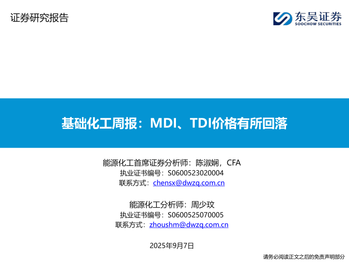 基础化工周报:MDI、TDI价格有所回落