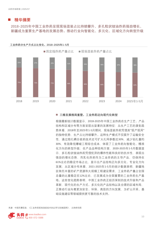 本报告全面分析中国民爆行业"十四五"发展成果,深入研究市场供需格局、产业集中度及技术创新状况。通过对工业炸药、工业雷管、爆破服务等细分领域现状及下游需求特征的系统梳理,探讨企业如何在严格监管下实现合规发展。报告同时对"十五五"期间市场前景、技术趋势及竞争策略进行前瞻分析,为民爆企业制定发展规划提供参考。