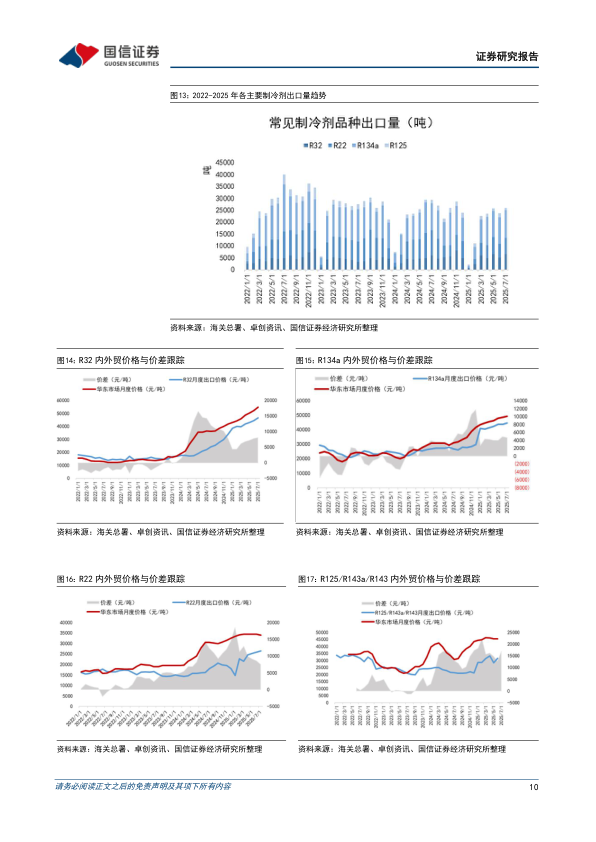 出口价格方面,截至2025年7月出口均价,R22、R32、R134a等产品外贸价格受海关出关、船运周期等因素影响,与内贸月度价格仍然倒挂,但企业端内外贸报价已协同一致。具体来看,2025年7月R32出口均价为46576元/吨,R22出口均价为26480元/吨,R134a出口均价为44598元/吨,R125/R143系列出口均价为31665元/吨。