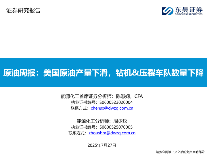原油周报:美国原油产量下滑,钻机&压裂车队数量下降