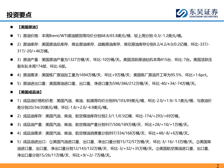 1)原油价格:本周Brent/WTI原油期货周均价分别68.8/65.8美元/桶,较上周分别-0.3/-1.2美元/桶。
