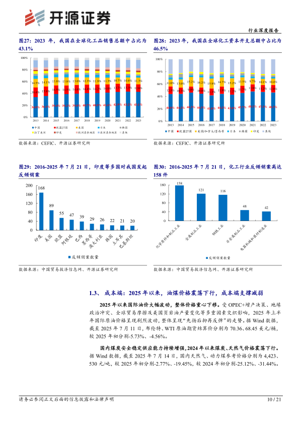国内:2025年《政府工作报告》提出,大力提振消费、提高投资效益,全方位扩大国内需求。其中实施提振消费专项行动举措包括,安排超长期特别国债3000亿元支持消费品以旧换新等,带动国内需求有望稳步恢复。海外:2023年中国化工品销售额约2.24万亿欧元,占全球化工品销售总额的43.1%,位居全球第一。同时,据中国贸易救济信息网数据,2016-2025年7月21日,全球对我国反倾销案共计720起,按行业分布,化学原料和制品工业位居第一,共涉及反倾销案158起,占比达21.9%。2025年来,欧洲多家化工巨头出现“关停潮”,但对国内相关化工品价格提振较小。我们认为,中国化工品销售额已连续多年稳居全球第一,在多国对华频繁发起反倾销背景下,海外需求增长空间或有限。