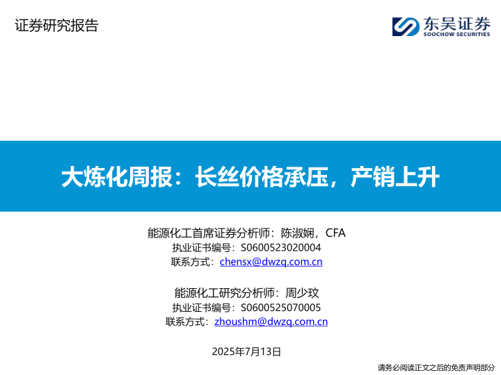 大炼化周报:长丝价格承压,产销上升