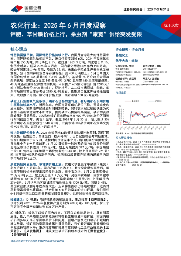 农化行业:2025年6月月度观察:钾肥、草甘膦价格上行,杀虫剂“康宽”供给突发受限