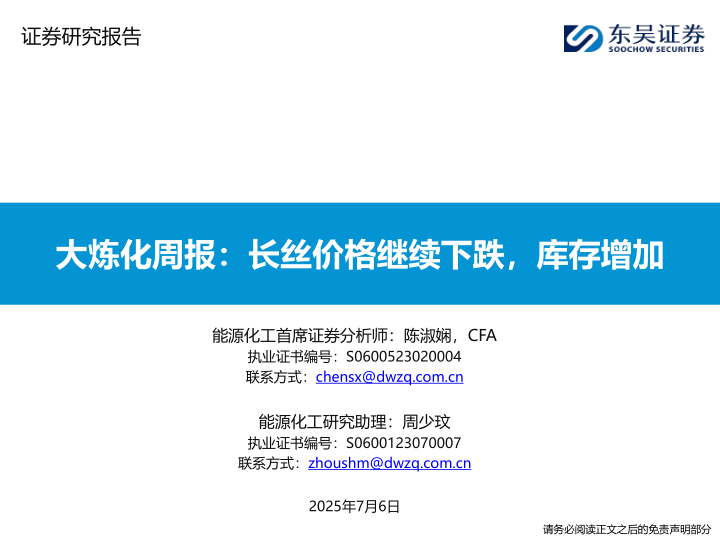 【聚酯板块】本周POY/FDY/DTY行业均价分别为6989/7250/8268元/吨,环比分别-186/-229/-161元/吨,POY/FDY/DTY行业周均利润为64/-29/50元/吨,环比分别+1/-27/+18元/吨,POY/FDY/DTY行业库存为21.7/22.4/28.6天,环比分别+4.5/+3.5/+3.3天,长丝开工率为90.9%,环比+0.4pct。下游方面,本周织机开工率为58.1%,环比-0.9pct,织造企业原料库存为10.4天,环比-1.1天,织造企业成品库存为28.0天,环比+0.8天。