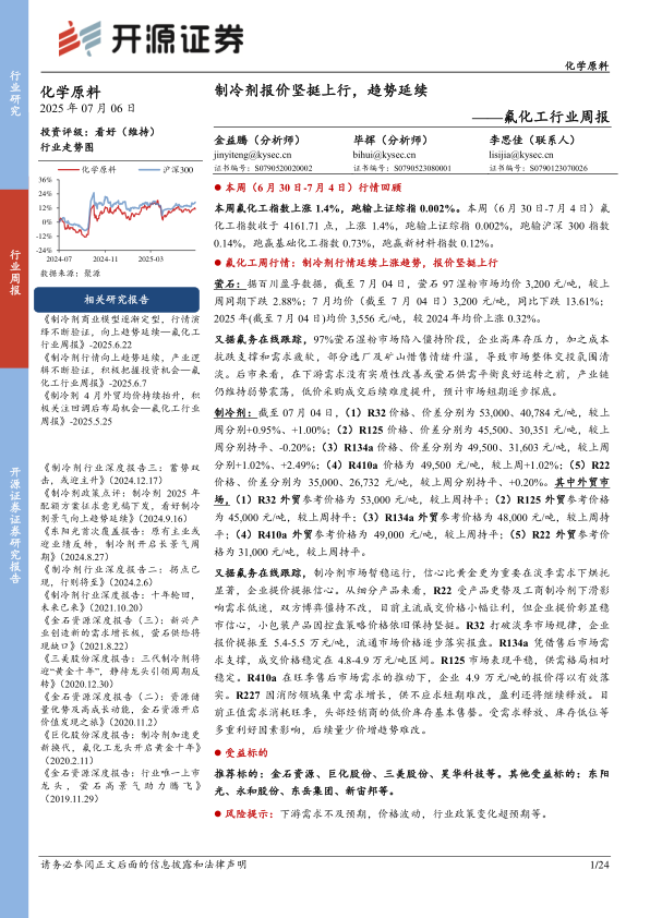 氟化工行业周报:制冷剂报价坚挺上行,趋势延续