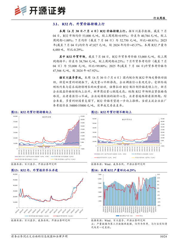 制冷剂:截至07月04日,(1)R32价格、价差分别为53,000、40,784元/吨,较上周分别+0.95%、+1.00%;(2)R125价格、价差分别为45,500、30,351元/吨,较上周分别持平、-0.20%;(3)R134a价格、价差分别为49,500、31,603元/吨,较上周分别+1.02%、+2.49%;(4)R410a价格为49,500元/吨,较上周+1.02%;(5)R22价格、价差分别为35,000、26,732元/吨,较上周分别持平、+0.20%。其中外贸市场,(1)R32外贸参考价格为53,000元/吨,较上周持平;(2)R125外贸参考价格为45,000元/吨,较上周持平;(3)R134a外贸参考价格为48,000元/吨,较上周持平;(4)R410a外贸参考价格为49,000元/吨,较上周持平;(5)R22外贸参考价格为31,000元/吨,较上周持平。