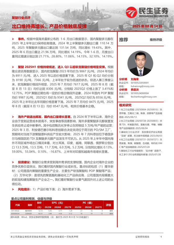 聚醚行业点评:出口维持高增长,产品价格触底反弹