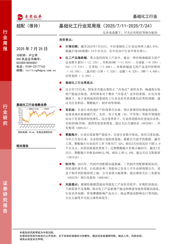 行情回顾:截至2025年7月24日,中信基础化工行业近两周上涨5.01%,跑赢沪深300指数1.54个百分点,在中信30个行业中排名第11。