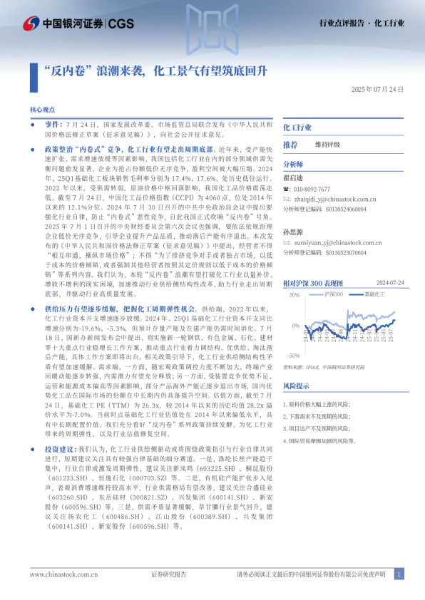政策整治“内卷式”竞争,化工行业有望走出周期底部。近年来,受产能快速扩张、需求增速放缓等因素影响,我国包括化工行业在内的部分领域供需失衡问题愈发显著,企业为抢占份额低价无序竞争,盈利空间被大幅压缩。2024年、2501基础化工板块销售毛利率分别为17.4%、17.6%,处历史低位运行2022年以来,受供需转弱、原油价格中枢回落影响,我国化工品价格震荡走低。截至7月24日,中国化工品价格指数(CCPI)为4060点,位处2014年以来的12.1%分位。2024年7月30日召开的中共中央政治局会议中提出要强化行业自律,防止“内卷式”恶性竞争,自此我国正式吹响“反内卷”号角。2025年7月1日召开的中央财经委员会第六次会议也强调,要依法依规治理企业低价无序竞争,引导企业提升产品品质,推动落后产能有序退出。本次发布的《中华人民共和国价格法修正草案(征求意见稿)》中提出,经营者不得相互串通,操纵市场价格”;不得“为了排挤竞争对手或者独占市场,以低于成本的价格倾销,或者强制其他经营者按照其定价规则以低于成本的价格倾销”等系列内容。我们认为,本轮“反内卷”浪潮有望打破化工行业以量补价、增收不增利的现实困境,加速推动行业供给侧结构性改革,助力行业走出周期底部,并驱动行业高质量发展