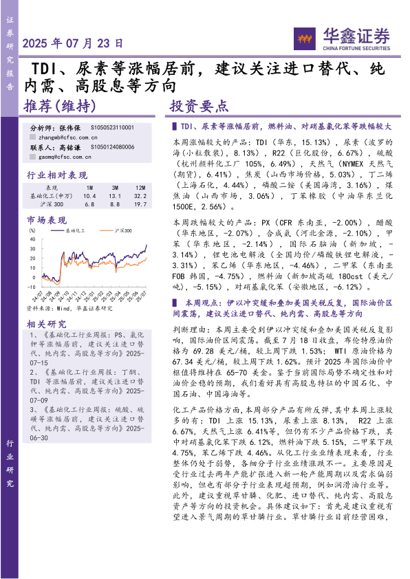 TDI、尿素等涨幅居前,建议关注进口替代、纯内需、高股息等方向