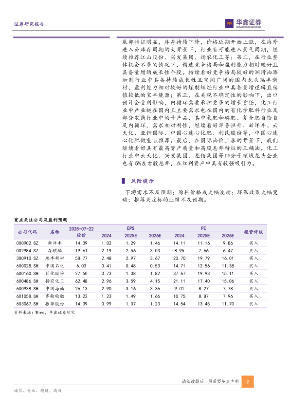 下游需求不及预期;原料价格或大幅波动;环保政策大幅变动;推荐关注标的业绩不及预期。