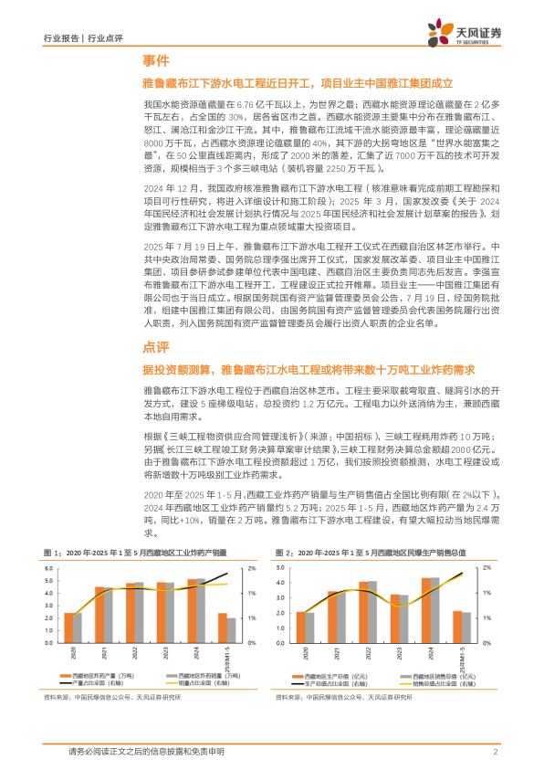 2024年,西藏地区工业炸药产销量均在5.2万吨左右,2025年1-5月,西藏地区炸药产量为2.4万吨,同比+10%,销量在2万吨。雅鲁藏布江下游水电工程建设,有望大幅拉动当地民爆需求。
