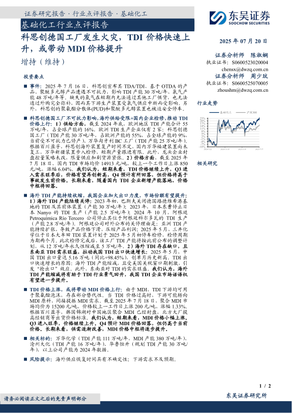 基础化工行业点评报告:科思创德国工厂发生火灾,TDI价格快速上升,或带动MDI价格提升