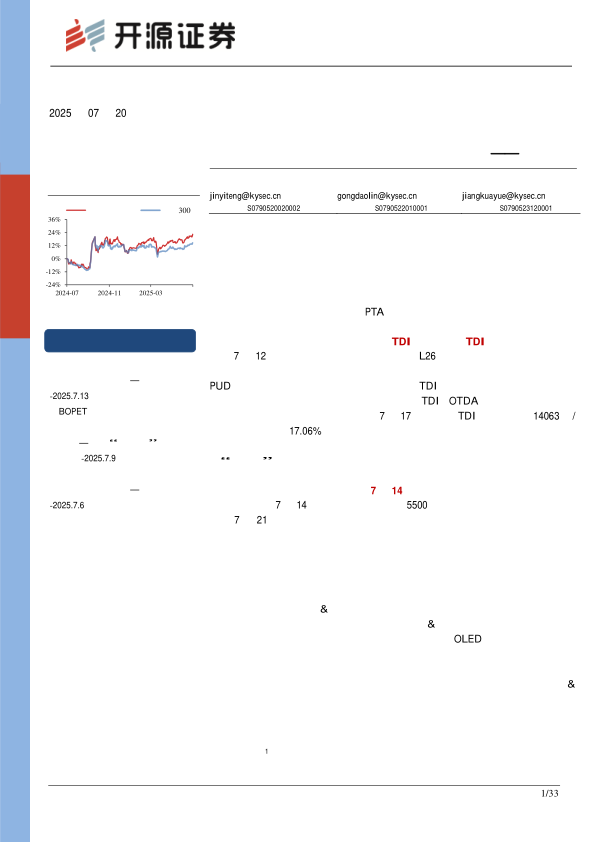 本周行业观点二:科思创德国宣布对TDI不可抗力,TDI价格强势上行由于7月12日凌晨,位于多尔马根化工园区L26号楼的一座外部变电站发生火灾,导致园区内部分区域突发且不可预见的停电。除过程控制系统外,科思创的PUD与聚醚多元醇装置以及氯气工厂(下游TDI工厂的氯气供应随之中断)也受到波及,被迫安全停车。科思创德国宣布对TDI、OTDA产品和聚醚多元醇产品不可抗力。据百川盈孚数据,截至7月17日,国内TDI市场均价为14063元/吨,较上周上涨17.06%。供方集中释放利好消息,包括主动上调报价、部分装置检修或延迟重启,叠加个别工厂放货周期拉长及缩量放货,市场流通货源收紧。在“反内卷”政策引导下,工厂挺涨意愿强烈,中间环节跟涨情绪高涨,市场报盘稳步上行。【推荐标的】万华化学;【受益标的】沧州大化。