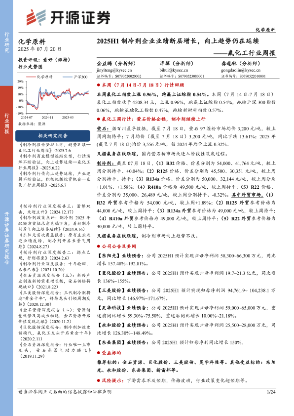 氟化工行业周报:2025H1制冷剂企业业绩断层增长,向上趋势仍在延续