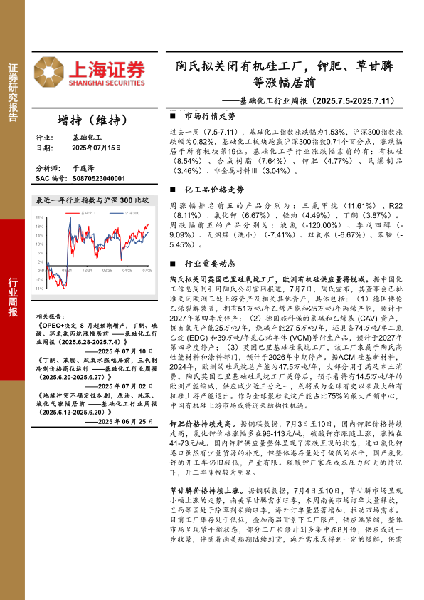 基础化工行业周报:陶氏拟关闭有机硅工厂,钾肥、草甘膦等涨幅居前