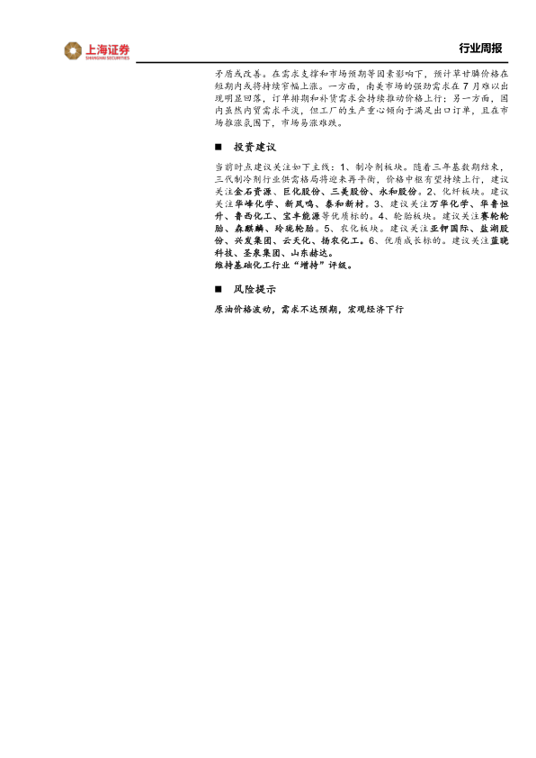 当前时点建议关注如下主线:1、制冷剂板块。随着三年基数期结束,三代制冷剂行业供需格局将迎来再平衡,价格中枢有望持续上行,建议关注金石资源、巨化股份、三美股份、永和股份。2、化纤板块。建议关注华峰化学、新凤鸣、泰和新材。3、建议关注万华化学、华鲁恒升、鲁西化工、宝丰能源等优质标的。4、轮胎板块。建议关注赛轮轮胎、森麒麟、玲珑轮胎。5、农化板块。建议关注亚钾国际、盐湖股份、兴发集团、云天化、扬农化工。6、优质成长标的。建议关注蓝晓科技、圣泉集团、山东赫达。