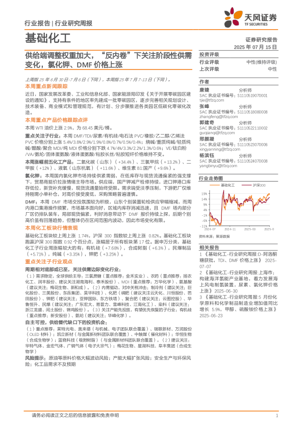 基础化工行业研究周报:供给端调整权重加大,“反内卷”下关注阶段性供需变化,氯化钾、DMF价格上涨