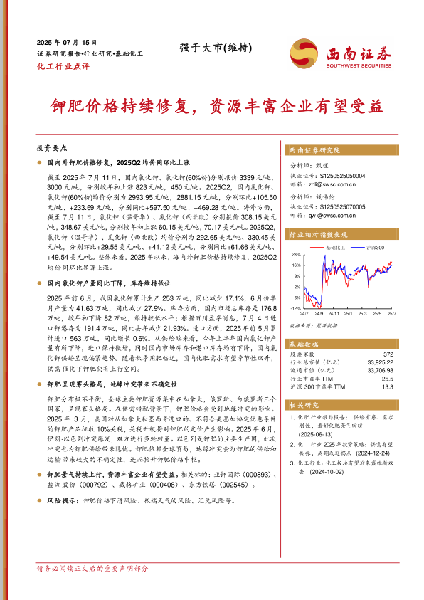 国内外钾肥价格修复,2025Q2均价同环比上涨