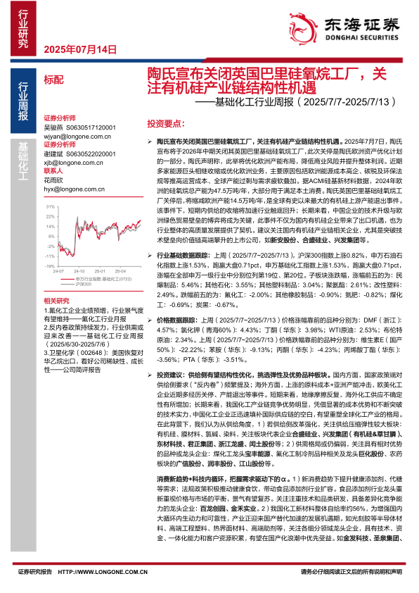 基础化工行业周报:陶氏宣布关闭英国巴里硅氧烷工厂,关注有机硅产业链结构性机遇