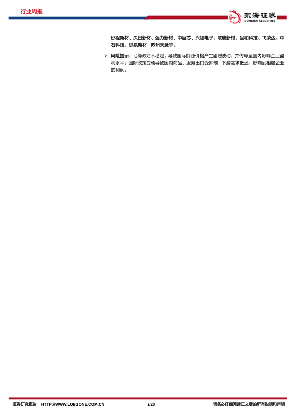 风险提示:地缘政治不稳定,导致国际能源价格产生剧烈波动,并传导至国内影响企业盈利水平;国际政策变动导致国内商品、服务出口受抑制;下游需求低迷,影响到相应企业的利润。