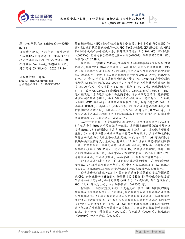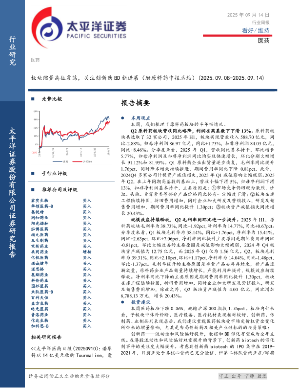 医药行业周报:板块缩量高位震荡,关注创新药BD新进展(附原料药中报总结)