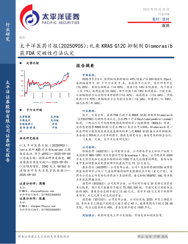 2025年9月5日,医药板块涨跌幅+2.42%,跑赢沪深300指数0.22pct,涨跌幅居申万31个子行业第9名。各医药子行业中,医疗研发外包(+5.05%)、其他生物制品(+4.00%)、疫苗(+2.14%)表现居前,线下药店(-0.11%)、医药流通(+0.56%)、体外诊断(+0.74%)表现居后。个股方面,日涨幅榜前3位分别为泽璟制药(+16.42%)、海辰药业(+16.64%)、多瑞医药(+13.92%);跌幅榜前3位为前沿生物(-16.34%)、舒泰神(-11.94%)、福元医药(-9.66%)。