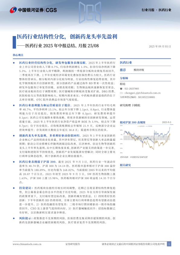 医药行业2025年中报总结、月报25/08:医药行业结构性分化,创新药龙头率先盈利
