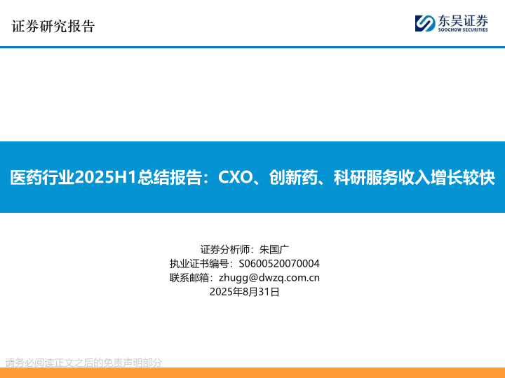 医药行业2025H1总结报告:CXO、创新药、科研服务收入增长较快