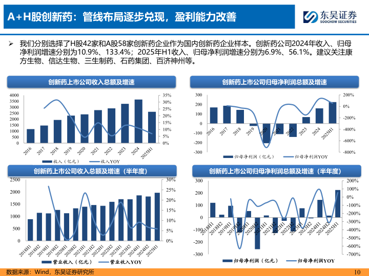 创新药:创新药现阶段已然成为医药板块的重要主线,为此我们分别选择了H股42家和A股58家创新药企业作为国内创新药企业样本,以衡量中国创新药市场整体发展趋势。创新药公司2024年收入、归母净利润增速分别为10.9%、133.4%;2025年H1收入、归母净利润增速分别为6.9%、56.1%。建议关注康方生物、信达生物、三生制药、石药集团、百济神州等。