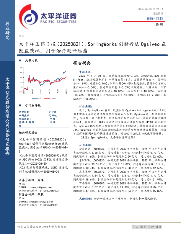 2025年8月21日,医药板块涨跌幅+0.22%,跑输沪深300指数0.17pct,涨跌幅居申万31个子行业第14名。各医药子行业中,医疗设备(+1.89%)、疫苗(+0.76%)、体外诊断(+0.42%)表现居前,医院(-0.63%)、医疗耗材(-0.54%)、医疗研发外包(+0.03%)表现居后。个股方面,日涨幅榜前3位分别为美好医疗(+18.00%)、仁和药业(+10.03%)、浩欧博(+8.42%);跌幅榜前3位为联环药业(-10.00%)、易明药业(-9.98%)、赛诺医疗(-8.21%)。