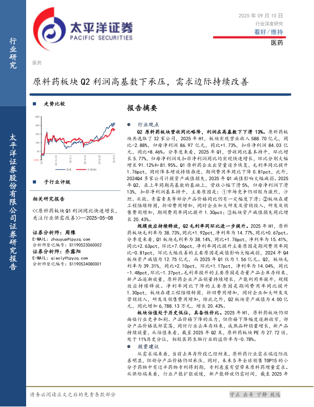 医药行业深度研究:原料药板块Q2利润高基数下承压,需求边际持续改善
