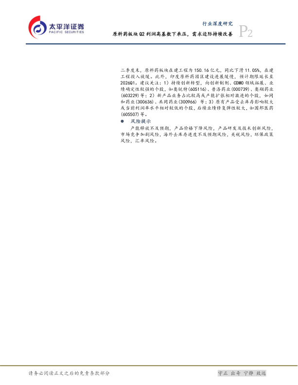 从需求端来看,当前去库存阶段已经结束,原料药行业需求端边际改善明显,但部分产品价格仍旧承压,同时,未来5年全球销售TOP15的小分子药物中有过半药物专利将到期,专利悬崖有望带来原料药增量需求。从供给端来看,行业产能扩张放缓,新产能释放仍需时间,截至2025年二季度末,原料药板块在建工程为150.16亿元,同比下滑11.05%,在建工程投入放缓。此外,印度原料药园区建设进展缓慢,预计期限延长至2026Q1。建议关注:1)持续创新转型,向创新制剂、CDMO领域拓展、业绩确定性较强的个股,如奥锐特(605116)、普洛药业(000739)、奥翔药业(603229)等;2)新产品业务占比较高或产能扩张相对激进的个股,如同和药业(300636)、共同药业(300966)等;3)原有产品受去库存影响较大或当前利润率水平相对较低的个股,后续业绩修复弹性较大,如国邦医药(605507)等。
