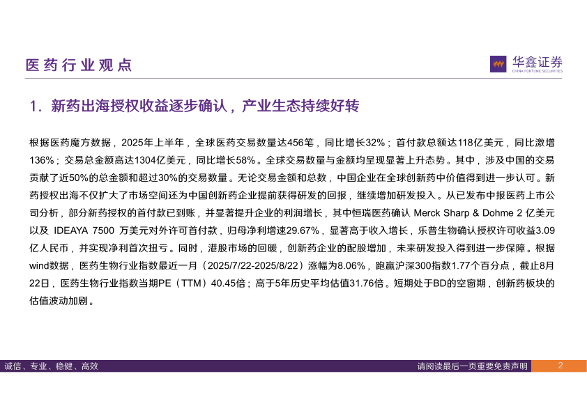 根据医药魔方数据,2025年上半年,全球医药交易数量达456笔,同比增长32%;首付款总额达118亿美元,同比激增136%;交易总金额高达1304亿美元,同比增长58%。全球交易数量与金额均呈现显著上升态势。其中,涉及中国的交易贡献了近50%的总金额和超过30%的交易数量。无论交易金额和总数,中国企业在全球创新药中价值得到进一步认可。新药授权出海不仅扩大了市场空间还为中国创新药企业提前获得研发的回报,继续增加研发投入。从已发布中报医药上市公司分析,部分新药授权的首付款已到账,并显著提升企业的利润增长,其中恒瑞医药确认Merck Sharp&Dohme2亿美元以及IDEAYA7500万美元对外许可首付款,归母净利增速29.67%,显著高于收入增长,乐普生物确认授权许可收益3.09亿人民币,并实现净利首次扭亏。同时,港股市场的回暖,创新药企业的配股增加,未来研发投入得到进一步保障。根据wind数据,医药生物行业指数最近一月(2025/7/22-2025/8/22)涨幅为8.06%,跑赢沪深300指数1.77个百分点,截止8月22日,医药生物行业指数当期PE(TTM)40.45倍;高于5年历史平均估值31.76倍。短期处于BD的空窗期,创新药板块的估值波动加剧。