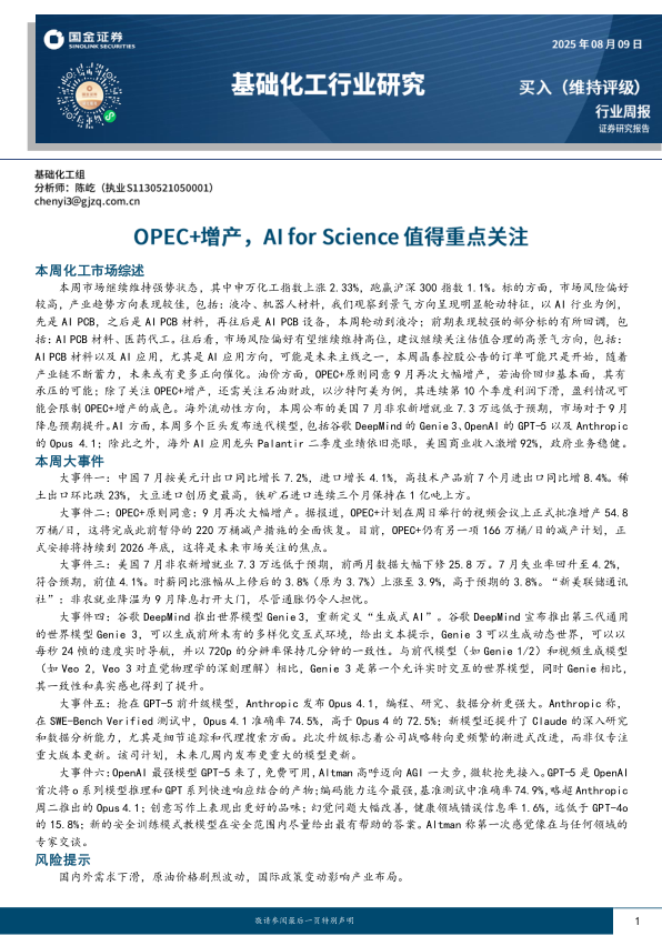 本周市场继续维持强势状态,其中申万化工指数上涨2.33%,跑赢沪深300指数1.1%。标的方面,市场风险偏好较高,产业趋势方向表现较佳,包括:液冷、机器人材料,我们观察到景气方向呈现明显轮动特征,以AI行业为例,先是AI PCB,之后是AI PCB材料,再往后是AI PCB设备,本周轮动到液冷;前期表现较强的部分标的有所回调,包括:AI PCB材料、医药代工。往后看,市场风险偏好有望继续维持高位,建议继续关注估值合理的高景气方向,包括:AI PCB材料以及AI应用,尤其是AI应用方向,可能是未来主线之一,本周晶泰控股公告的订单可能只是开始,随着产业链不断蓄力,未来或有更多正向催化。油价方面,OPEC+原则同意9月再次大幅增产,若油价回归基本面,其有承压的可能;除了关注OPEC+增产,还需关注石油财政,以沙特阿美为例,其连续第10个季度利润下滑,盈利情况可能会限制OPEC+增产的成色。海外流动性方向,本周公布的美国7月非农新增就业7.3万远低于预期,市场对于9月降息预期提升。AI方面,本周多个巨头发布迭代模型,包括谷歌DeepMind的Genie3、OpenAI的GPT-5以及Anthropic的Opus4.1;除此之外,海外AI应用龙头Palantir二季度业绩依旧亮眼,美国商业收入激增92%,政府业务稳健。