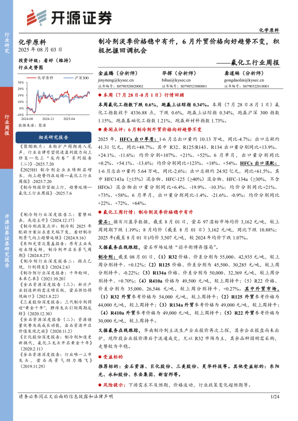 氟化工行业周报:制冷剂淡季价格稳中有升,6月外贸价格向好趋势不变,积极把握回调机会