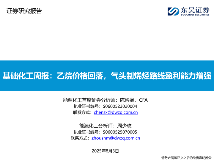 基础化工周报:乙烷价格回落,气头制烯烃路线盈利能力增强