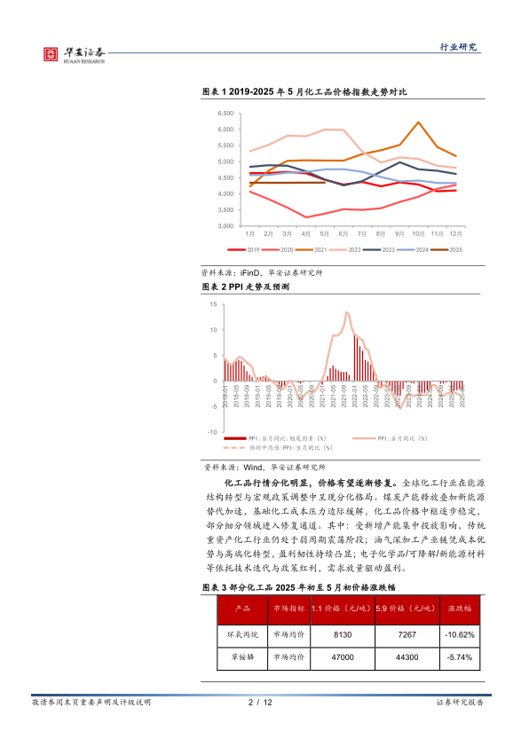 化工品行情分化明显,价格有望逐渐修复。全球化工行业在能源结构转型与宏观政策调整中呈现分化格局。煤炭产能释放叠加新能源替代加速,基础化工成本压力边际缓解,化工品价格中枢逐步稳定,部分细分领域进入修复通道。其中:受新增产能集中投放影响,传统重资产化工行业仍处于弱周期震荡阶段;油气深加工产业链凭成本优势与高端化转型,盈利韧性持续凸显;电子化学品/可降解/新能源材料等依托技术迭代与政策红利,需求放量驱动盈利。