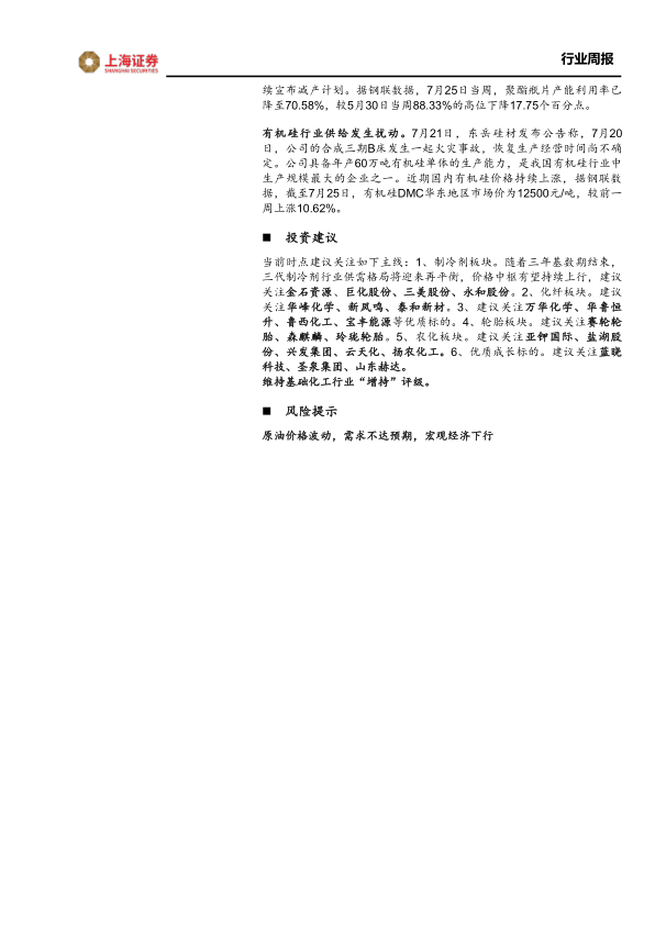有机硅行业供给发生扰动。7月21日,东岳硅材发布公告称,7月20日,公司的合成三期B床发生一起火灾事故,恢复生产经营时间尚不确定。公司具备年产60万吨有机硅单体的生产能力,是我国有机硅行业中生产规模最大的企业之一。近期国内有机硅价格持续上涨,据钢联数据,截至7月25日,有机硅DMC华东地区市场价为12500元/吨,较前一周上涨10.62%。