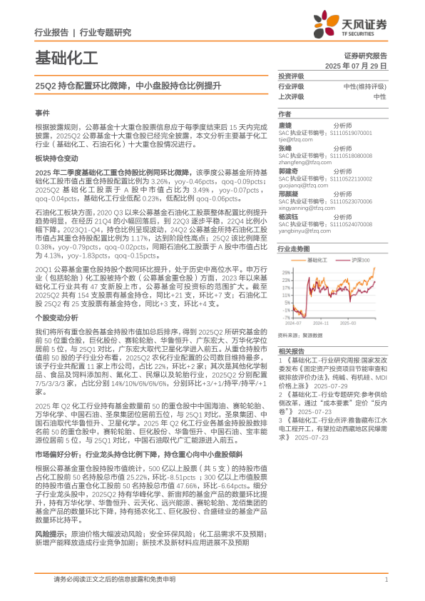 基础化工行业专题研究:25Q2持仓配置环比微降,中小盘股持仓比例提升