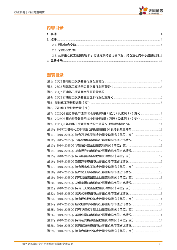 根据披露规则,公募基金十大重仓股票信息应于每季度结束后15天内完成披露,2025Q2公募基金十大重仓股已经完全披露,本文分析主要基于化工行业(基础化工、石油石化)十大重仓股情况进行。