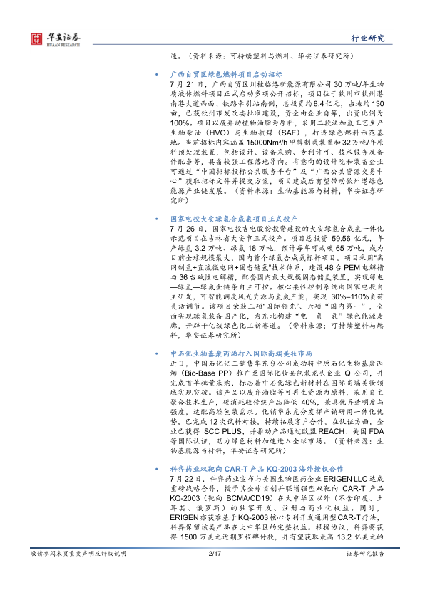 7月21日,广西自贸区川桂临港新能源有限公司30万吨/年生物质液体燃料项目正式启动多项公开招标,项目位于钦州市钦州港南港大道西面、铁路牵引站南侧,总投资约8.4亿元,占地约130亩,已获钦州市发改委批准建设,资金由企业自筹,出资比例为100%。项目以废弃动植物油脂为原料,采用二段法加氢工艺生产生物柴油(HVO)与生物航煤(SAF),打造绿色燃料示范基地。当前招标内容涵盖15000Nm3/h甲醇制氢装置和32万吨/年原料预处理装置,包括设计、设备采购、专利许可、技术服务及备件配套等,具备较强工程落地导向。有意向的设计院和装备企业可通过“中国招标投标公共服务平台”及“广西公共资源交易中心”获取招标文件并提交方案,项目建成后有望带动钦州港绿色能源产业链发展。(资料来源:生物基能源与材料,华安证券研究所)