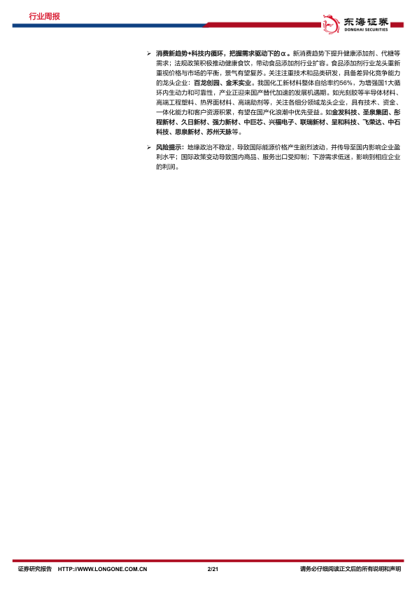 消费新趋势+科技内循环,把握需求驱动下的α。新消费趋势下提升健康添加剂、代糖等需求;法规政策积极推动健康食饮,带动食品添加剂行业扩容。食品添加剂行业龙头重新重视价格与市场的平衡,景气有望复苏。关注注重技术和品类研发,具备差异化竞争能力的龙头企业:百龙创园、金禾实业。我国化工新材料整体自给率约56%,为增强国1大循环内生动力和可靠性,产业正迎来国产替代加速的发展机遇期。如光刻胶等半导体材料、高端工程塑料、热界面材料、高端助剂等,关注各细分领域龙头企业,具有技术、资金、一体化能力和客户资源积累,有望在国产化浪潮中优先受益。如金发科技、圣泉集团、彤程新材、久日新材、强力新材、中巨芯、兴福电子、联瑞新材、呈和科技、飞荣达、中石科技、思泉新材、苏州天脉等。